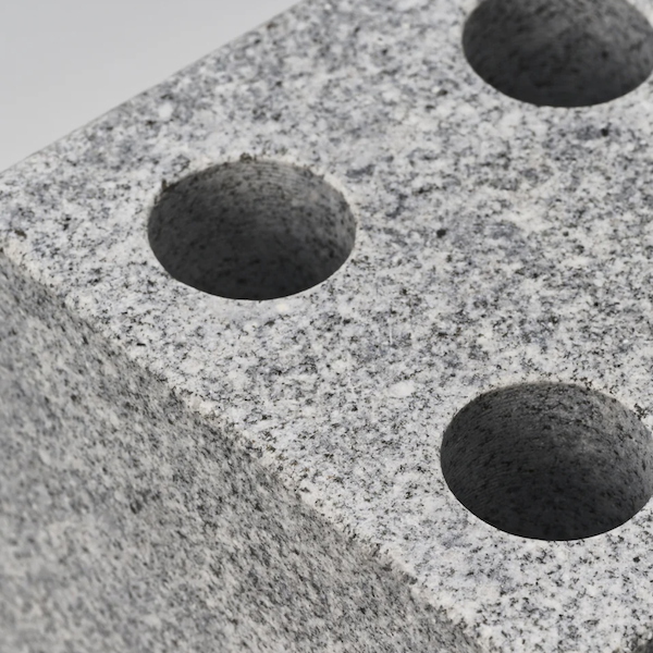 A simple umbrella stand made from a slim slab of stone. In addition to the umbrella holes, there is a bottom aperture for drainage.