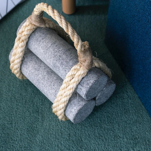 This is a door stopper made from three stones carved into a cylindrical shape bundled by hemp rope. The hemp rope that binds the stones acts as a cushioning material between the stone and the floor.