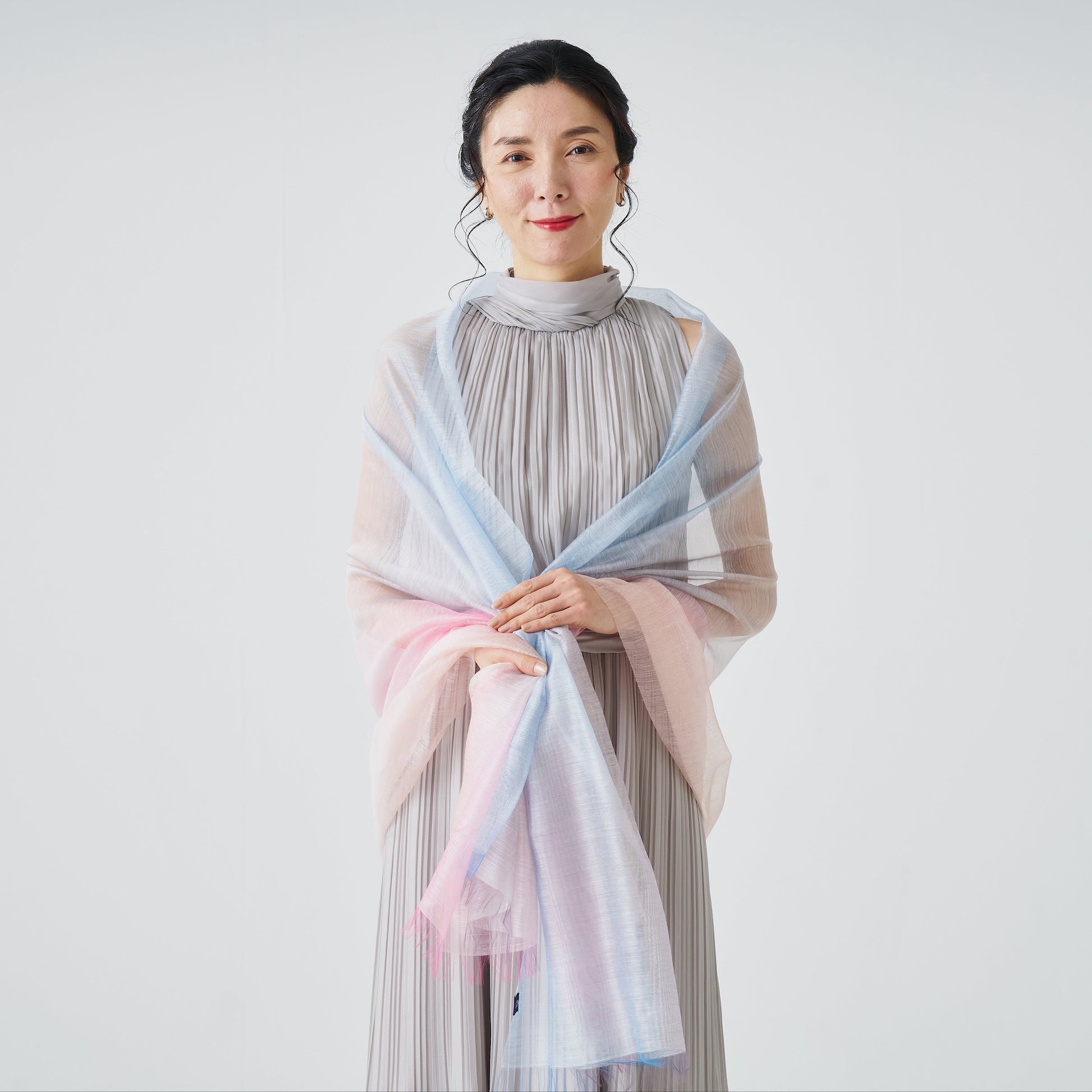 Silk cashmere is one of the few natural materials that works throughout the year. In spring and autumn, it works as a light layer over the shoulders. In summer, it deflects air conditioning and sun. The luster and gradient read well at formal occasions — weddings, evening events, or any setting where a garment needs to carry some weight without effort.