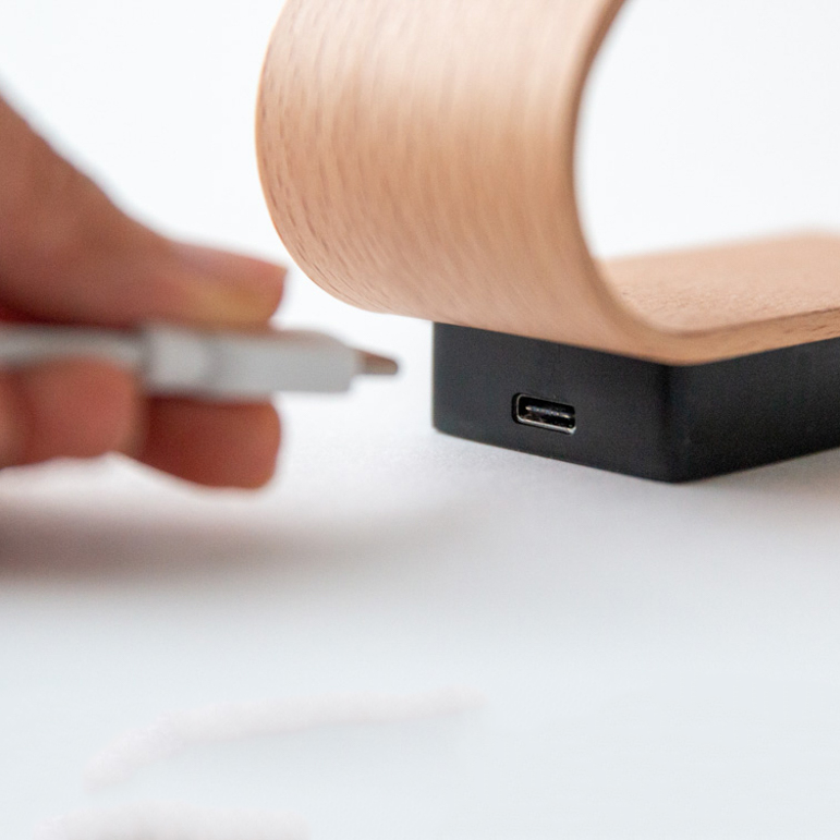 The compact body, weighing just 170 g, is equipped with an LED light and a rechargeable battery. It can be charged using the included USB cable and used anywhere you like. A light touch turns the lamp on, and the brightness can be adjusted by tapping multiple times.